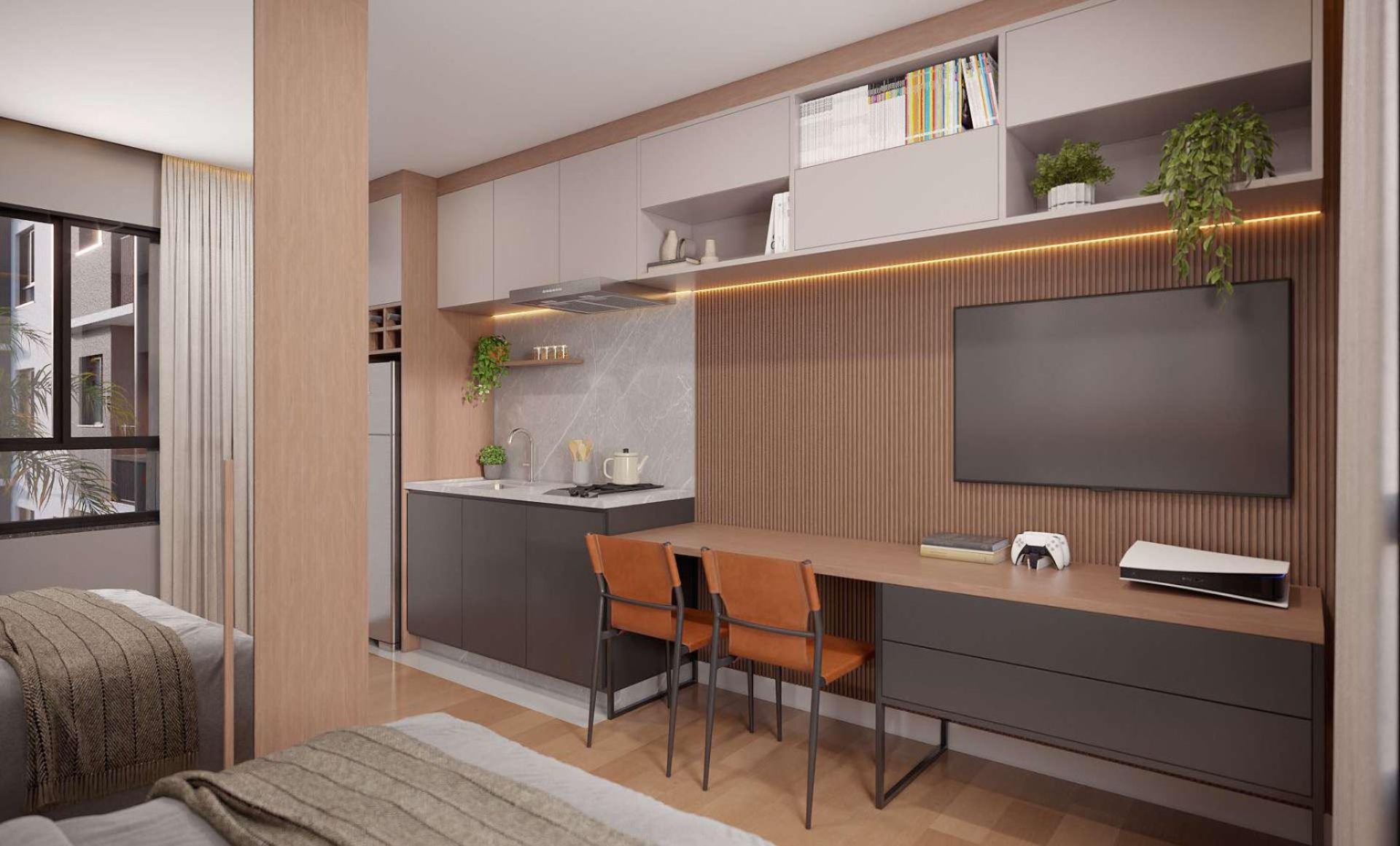 2 Dormitórios: Unidades de 34,92 m² a 43,77 m², projetadas em conceito aberto e com sacada com churrasqueira.